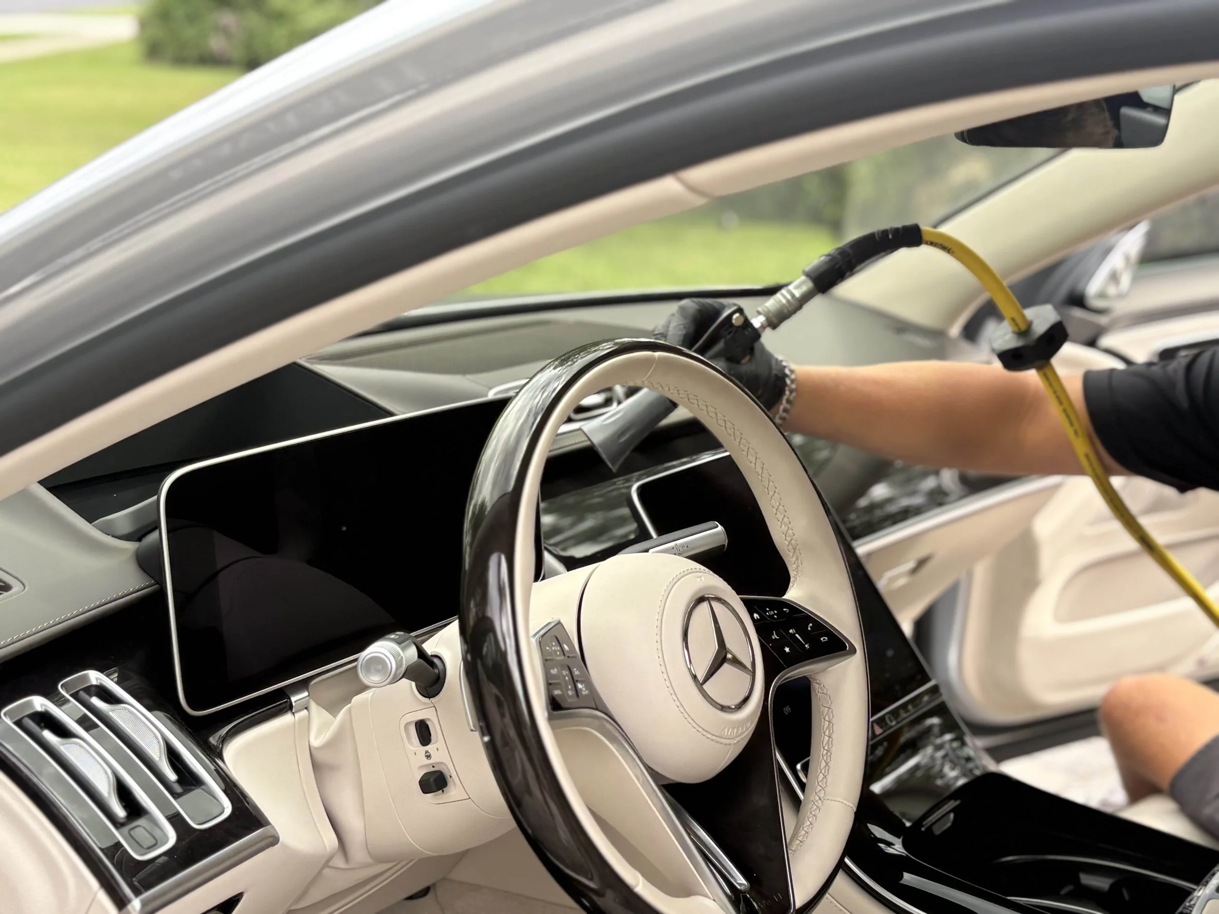 - Crevices blown out + high-touch areas cleaned (dash, console, doors)